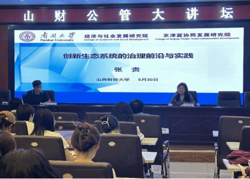 2024年5月30日下午,山财公管大讲坛第12讲在博学楼二层大会议室举行,南开大学京津冀协同发展研究院张贵教授为十大买球官网师生做了以“创新生态系统的治理前沿与实践”为主题的精彩学术报告。党委常委、副校长张卫国教授及其学院八十余名师生聆听了报告,院长郭淑芬教授主持了报告会。