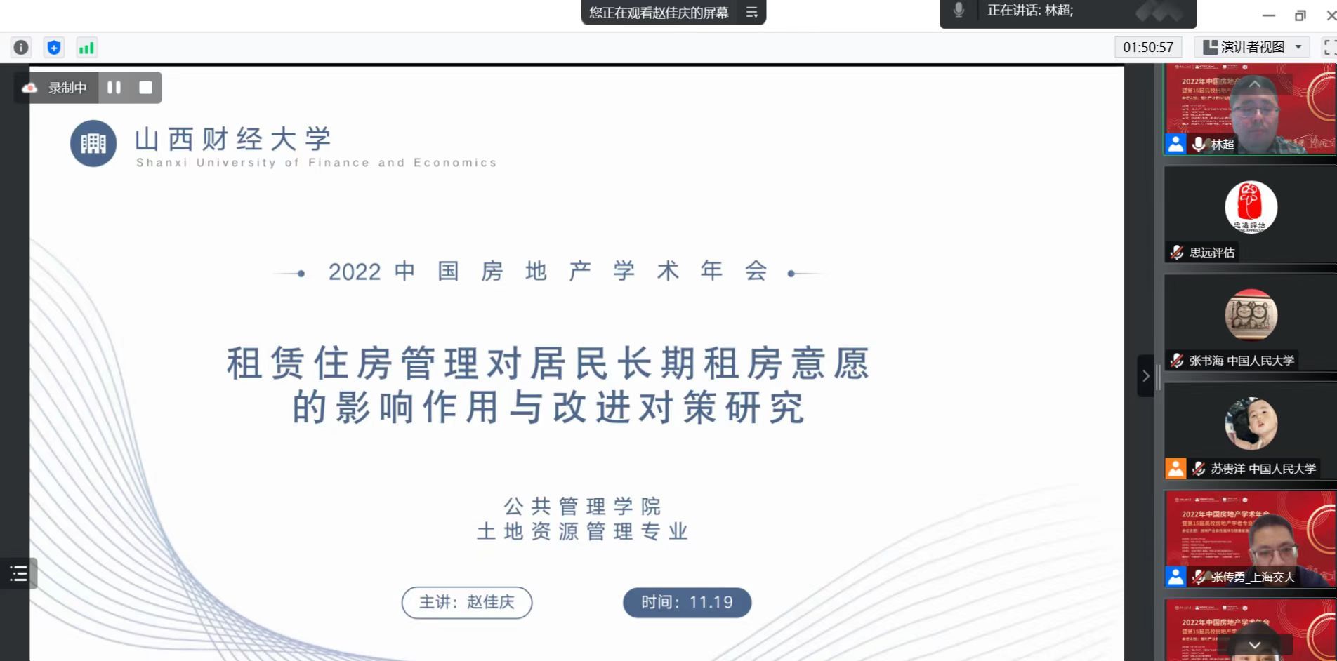 年会共分11个分论坛,分别是:房地产市场的长效机制与健康发展、房地产价格及其影响因素、房价、住房需求偏好与家庭消费、城市群和都市区住房供给、城市建设与乡村振兴、住房租赁市场与金融创新、住房保障与劳动力市场、房地产业发展与技术创新、房地产开发与企业行为、房地产专业发展与学科建设、房地产经纪人培养路径与职业发展。林超副教授作为第六分会场主持人参与会议,研究生赵佳庆对论文进行汇报,并与清华大学、上海交通大学、重庆大学、中央财经大学、浙江工业大学、西安建筑科技大学等师生进行了深入交流。