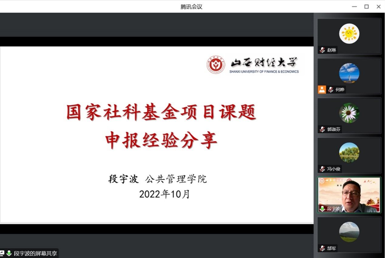 2022年11月1日下午,十大买球的正规网站通过“尚公青年沙龙”学术平台举办第三场国家级科研项目申报经验交流会,学院副院长、2022年国家社科基金项目主持人段宇波副教授做了《国家社科基金项目课题申报经验分享》的报告,副院长冯小俊主持了交流会,100余名师生在线参加了经验交流会。