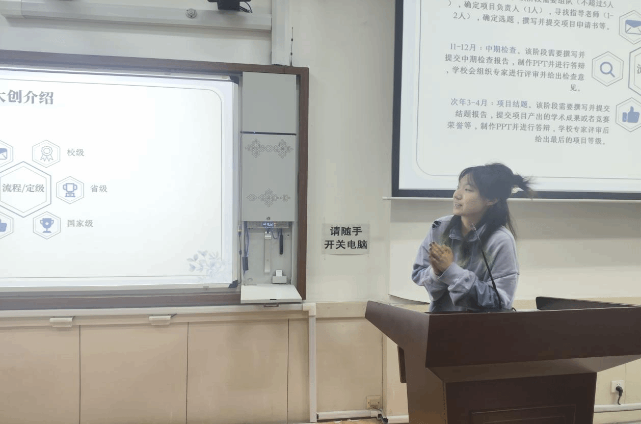 郭祉妤同学是2021级劳动与社会保障班的学生,六学期综合测评班级第一,已推免至山西大学攻读硕士。她在大学生创新创业训练项目申请中表现出色,获国家级和省级立项。她分享了项目从选题、组队到立项、答辩的全过程,强调团队协作和创新思维的重要性,她认为,参与相关项目能培养创新能力、创业精神和实践能力,积累科研经验,这对将来投身科学研究、实现个人成长与价值具有重要意义。