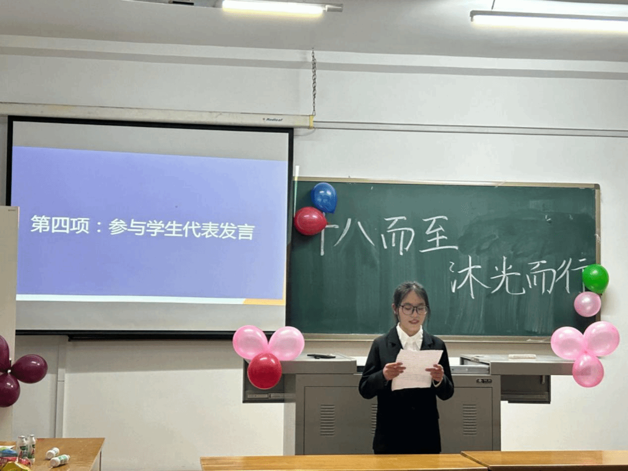 学生代表诵读李大钊的《青春》之诗,鼓励青年为国家建设奋斗,努力成为担当民族复兴大任的时代新人,并分享自己对于成年的感悟,与同学们共勉:十八岁意味着迈入成人之门,迈向人生新起点,踏上人生新征程。自古英雄出少年,每个时代都有每个时代的挑战与考验,作为新时代山财学子,必将蓄势待发,磨砺以须,挺膺担当,不负使命。
