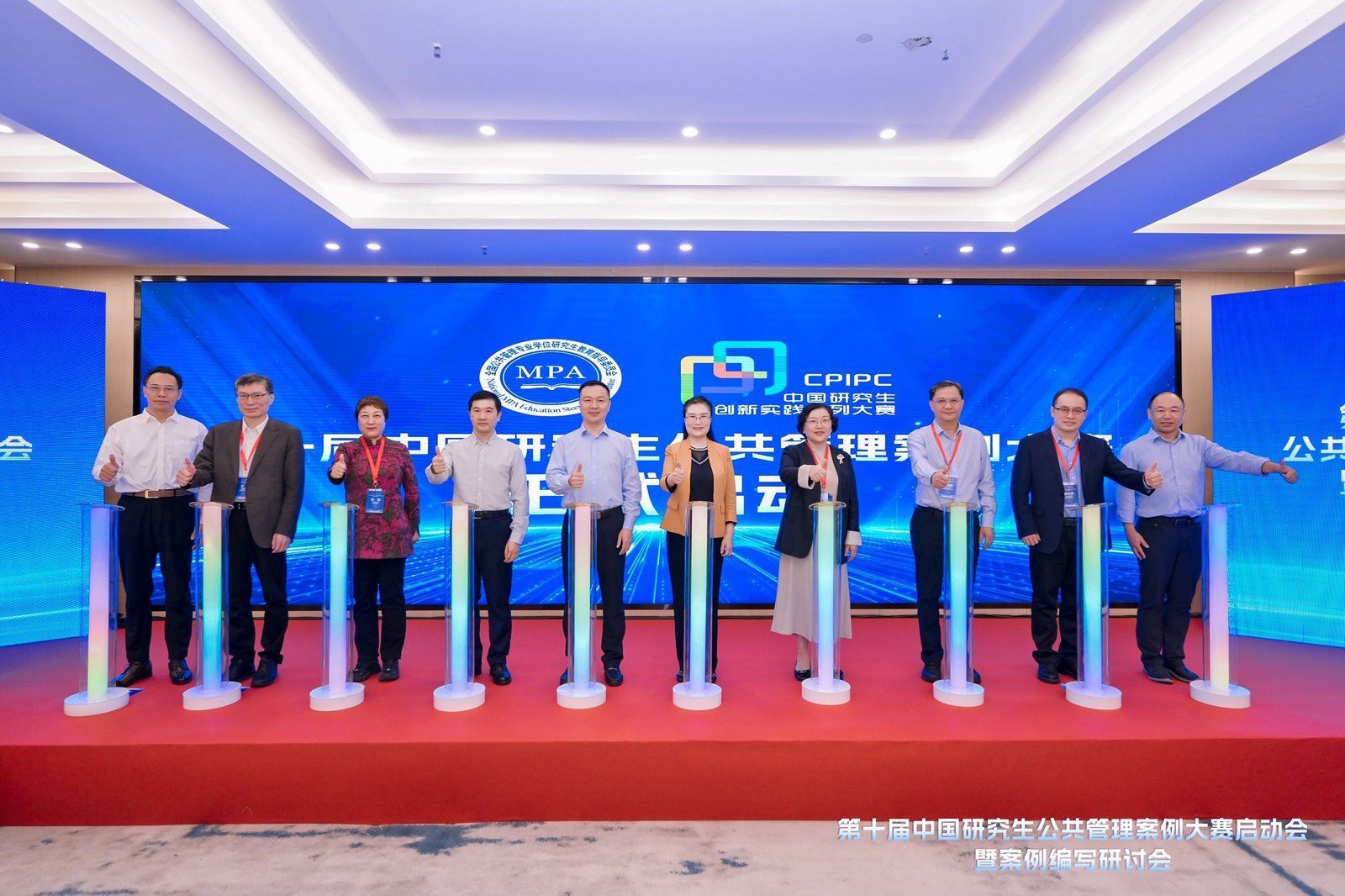 国家表彰奖励办公室原主任、MPA教指委原副主任委员、中国人才研究会副会长刘丽军,深圳大学党委副书记吴报水,深圳市政务服务和数据管理局副局长胡锴,MPA教指委委员姜晓萍、孙萍、蔡劲松、赵志荣、王健、周忠良,深圳大学政府管理学院党委书记何燕辉等领导和专家亲临开幕式现场。MPA教指委秘书长严金明教授通过线上方式出席并致辞。在全体与会嘉宾和参会师生的共同见证下,刘丽军、吴报水、胡锴、姜晓萍、孙萍、蔡劲松、赵志荣、王健、周忠良、何燕辉等领导共同按下启动按钮,正式拉开了第十届中国研究生公共管理案例大赛帷幕。