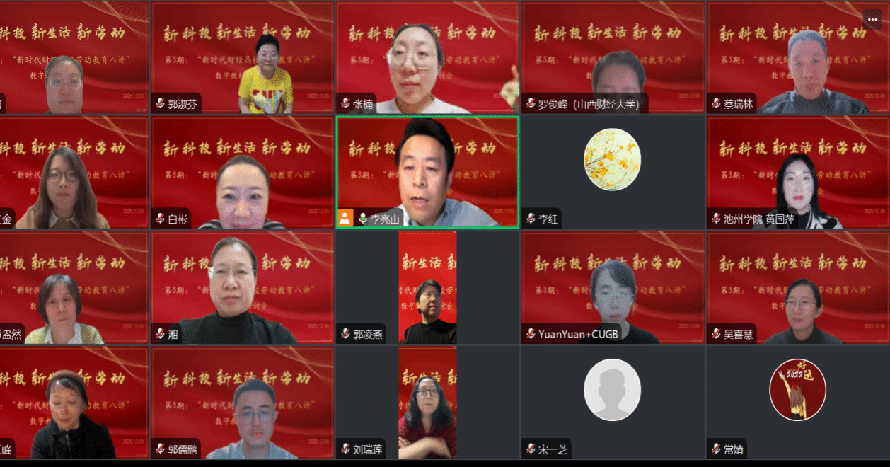 12月9 日,“新科技、新生活、新劳动” 主题论坛暨第 3 期 “新时代财经高校劳动教育八讲” 数字教材研讨活动通过腾讯会议线上召开。十大买球官网劳动教育虚拟教研室牵头组织,三位劳动教育国一流课程负责人组成专家团,十大买球官网八位教材编写教师及虚拟教研室全体教师齐聚云端,为数字教材完善建言献策,助力财经高校劳动教育高质量发展。