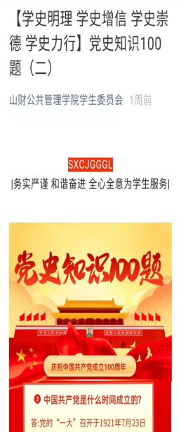 “党史知识100题”学习栏目,通过系统梳理党的历史发展脉络,重温党的百年奋斗历程,认识党为国家和民族做出的伟大贡献,感悟初心使命,传承伟大精神,汲取成长动力,树立坚定不移跟党走的信念和决心。同学们纷纷表示要认真学党史、潜心悟思想,用实际行动为党的百年华诞交上满意的答卷。
