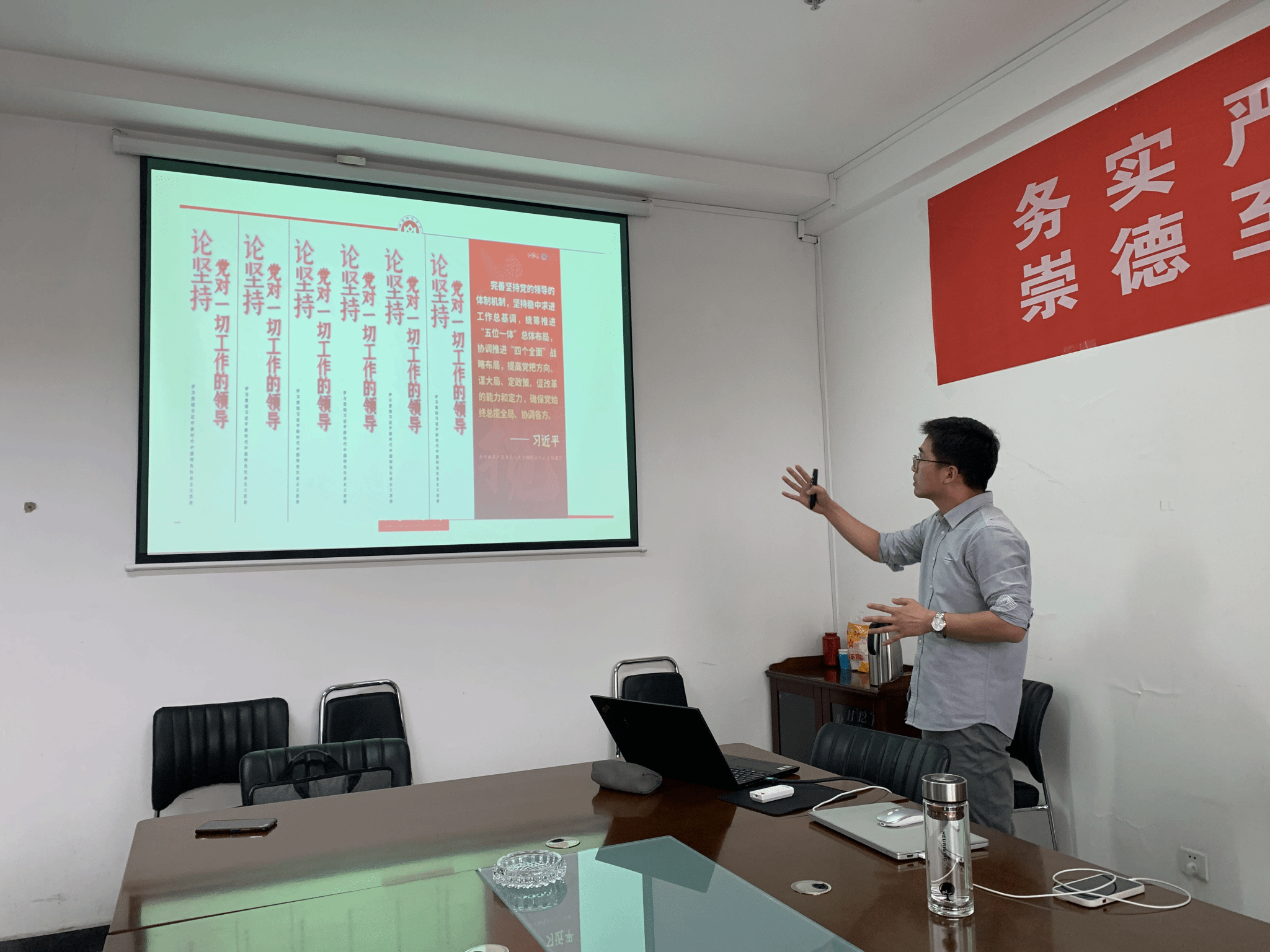 刘汉超首先就此次活动的缘由进行了简要说明。他讲到,此次活动是为了进一步发挥党建在教学科研中的引领作用,积极践行支部活动聚焦主责主业的要求而举办的,是一次兼具政治性与学术性的支部活动。随后,他又对此次活动的主题选择做了解释。他认为,作为一名党员必须深刻理解党的领导,对于实现党的领导的体制机制应该有系统全面的了解,因此很有必要进行学习。另外,中国公共管理的主体不仅仅有政府,中国共产党也在履行公共管理的职责,因此从专业性的角度而言,也很有必要深入理解党的领导。