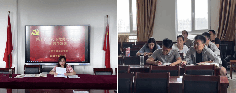会议第一个议程,各党支部就换届后工作开展情况作交流汇报。行政管理系党支部书记刘汉超讲到:“根据学校主题教育要求,我们支部近期开展了三次集中学习,学习了党的二十大精神、中国共产党章程等内容,同时进行线上线下交流研讨并撰写心得体会。”接着各党支部书记分别从支部建设、党员发展工作、“三会一课”制度的落实以及主题教育的开展等方面做出汇报。部军书记对各支部近期工作表示肯定,但他提出,各支部仍需进一步加强认识,严肃开展党务工作,支部是党的最基层组织,要将党的一切工作具体到支部,明晰工作职责,认清主职主业,克服一切困难,创造性地开展工作。会议第二个议程,由王琼老师带领大家共同学习《关于新形势下党内政治生活的若干准则》。王琼老师从《准则》的十二个方面详细地进行解读,她强调:“作为党员,要做到坚定理想信念、坚持党的基本路线、严明组织纪律、保持廉政本色等准则,今天,我们共同的学习与思考,将引领我们在思想认识上持续深化,在实践行动上更加有序规范。”部军书记紧接着谈到,我们要深刻认识《准则》的重要性,挺直腰杆,严格遵照《准则》开展工作,他提议各支部要以《准则》为主题开展一次集中学习,坚持“三会一课”制度、民主生活会与组织生活会制度与谈心谈话制度,以确保支部工作的有序开展。