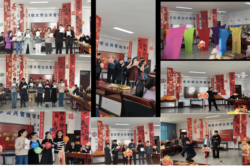 在联欢会的节目表演中,师生们展现了他们的新颖创意、精神活力、家国情怀和美好希冀。行政管理系的老师们表演的舞蹈《爱如火》从着装、音乐、色彩、舞姿等方面都极具创意,体现了先锋的艺术气息,令人印象深刻;段宇波副院长和宣星宇、靳永广、刘汉超老师带来的朗诵《我爱科研》用幽默诙谐的方式表达了对科研工作的体会与热爱,引来阵阵笑声。许钰婉、许晶晶、黄维峰、王乾呈4名学生带来的街舞表演《东西合璧》极具感染力,让在场的老师们都感受到了扑面而来的青春气息;吴喜慧、向燕芸、袁媛、宋一芝4位青年教师演唱了歌曲《上春山》,她们活力满满、开心喜悦的表演状态触动到了在场的每个人;赵波老师独唱的《麻雀》蕴含的乐观顽强的精神斗志,给人鼓舞和力量。王琼、张凯老师与学生代表演唱的《我和我的祖国》,土地资源管理系教师集体朗诵的《祖国是什么》体现了他们对祖国深深的眷恋,其中的声音和词句都令人动容;劳动与社会保障系教师集体朗诵的《共筑社会保障之光》表达了对公平正义社会保障体系的追求,这份大爱情怀令人感佩。学院领导班子最后演唱的《在希望的田野上》寄托了对十大买球的正规网站未来发展的美好愿望,激励着全院师生为十大买球的正规网站更加美好的明天努力奋斗。